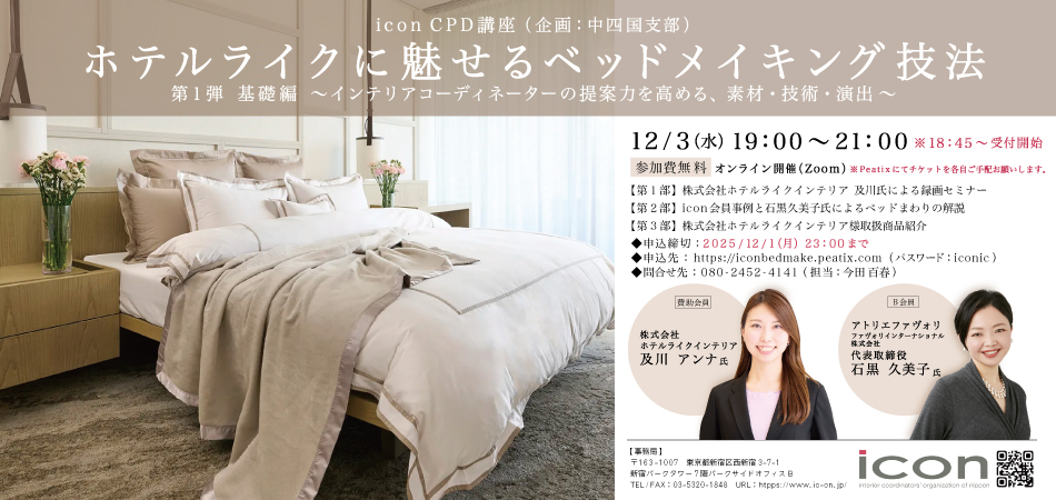 【iconCPD講座】12/3「ホテルライクに魅せるベッドメイキング技法」第1弾 基礎編 〜インテリアコーディネーターの提案力を高める、素材・技術・演出〜